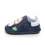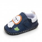 Pantofiori pentru baietei din piele ecologica, bleumarine cu un leu si cu un iepuras aplicati, se inchid cu barete cu arici in parti facilitand incaltarea cu usurinta a micutului.