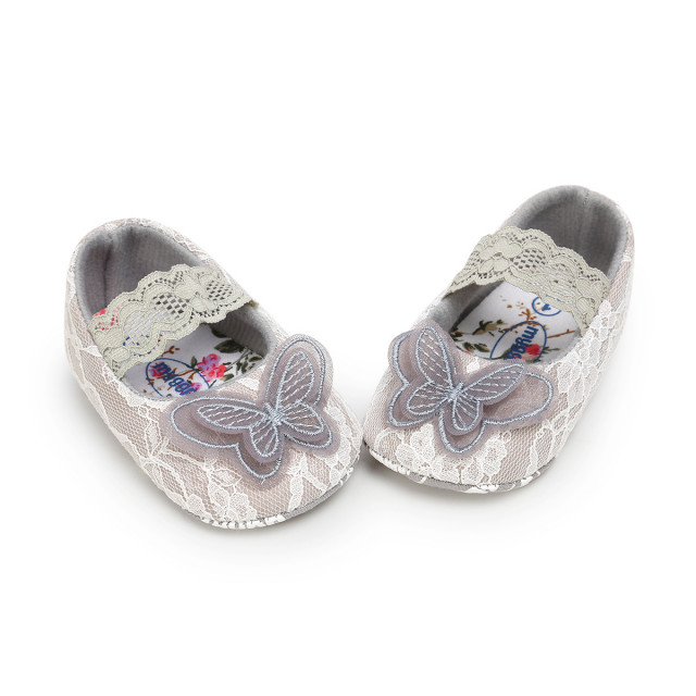 Pantofiori pentru fetite, din material textil, imbracati in danteluta, cu un fluturas gri aplicat. Se prind de piciorus cu bareta din danteluta.