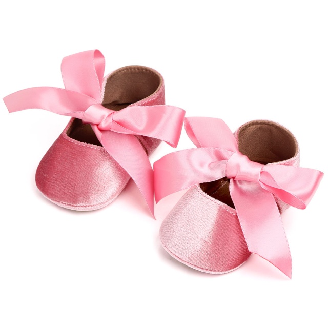 Pantofiori pentru bebelusi din material catifelat roz, decorati cu panglica din satin eleganta.