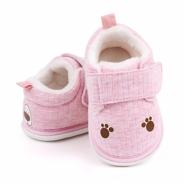 Pantofiori imblaniti pentru fetite din material textil, cu labute imprimate in fata, se inchid cu bareta cu arici intr-o parte facilitand incaltarea cu usurinta a micutului.