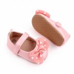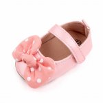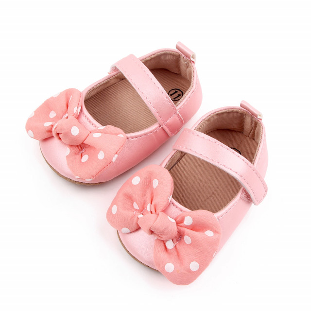 Pantofiori pentru fetite din material tip piele ecologica, sidefati, cu o fundita cu bulinute albe aplicata in fata. Se inchid cu bareta cu arici intr-o parte.
