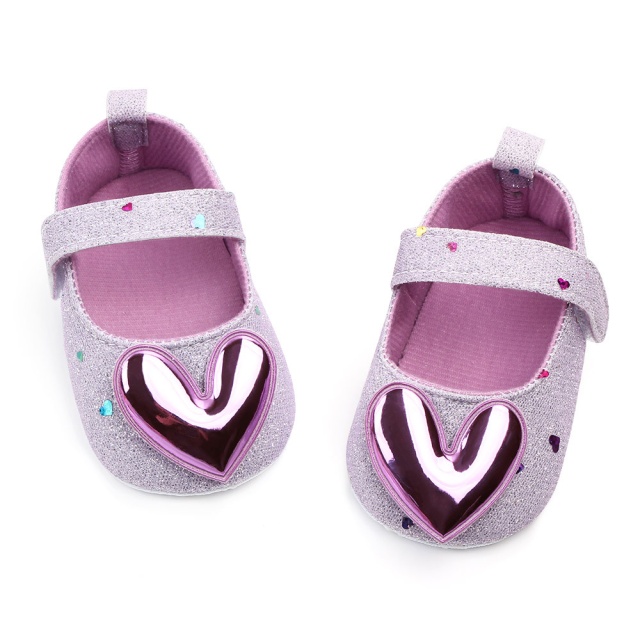 Pantofiori pentru bebelusi de culoare lila, cu design modern si inima decorativa pe varf.