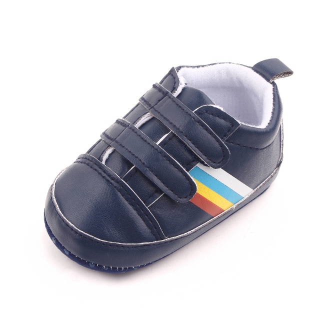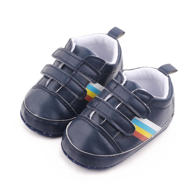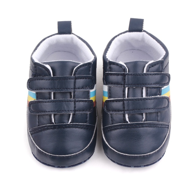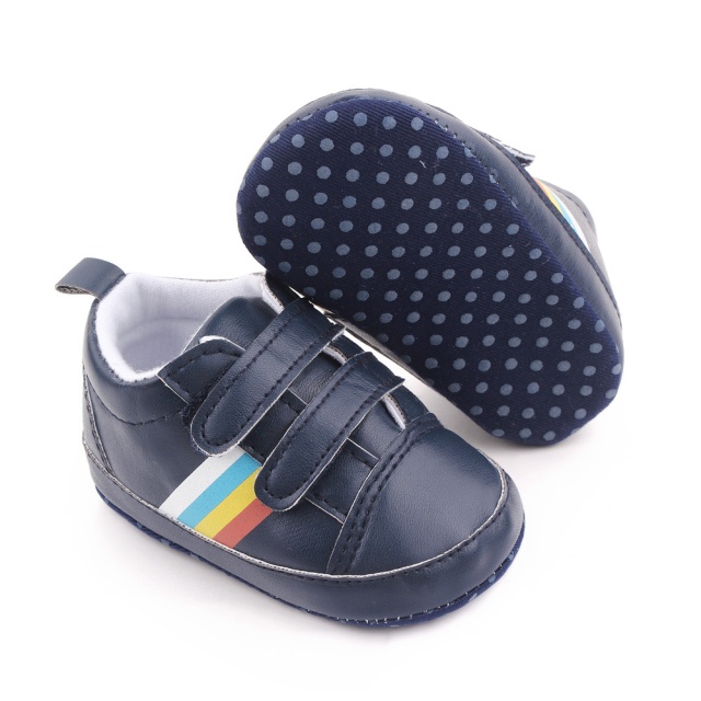 Pantofiori sport pentru bebelusi, de culoare bleumarin, cu dungi multicolore laterale, perfecti pentru micii exploratori.