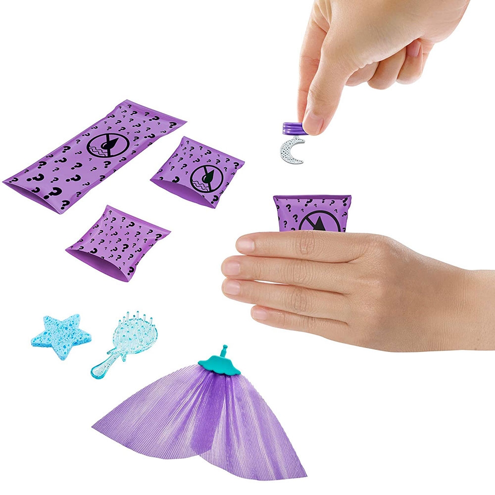 - Fiecare papusa are o combinatie diferita de culoare a ochilor, culoarea parului, tonul pielii si corsetul decorat, dar surprizele continua, deschide pungile pentru a descoperi o aripioara de sirena, un colier, o perie si un burete mic