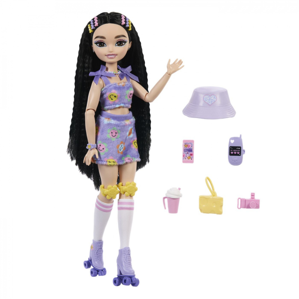 Papusa este articulata si vine cu haine detasabile un top si o fusta cu imprimeu floral si blanita, sosete lungi albe cu dungi roz si patine cu role mov decorate cu flori.