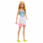 Pachetul include papusa profesoara Barbie imbracata intr-o fusta alba si un top albastru cu mov, poarta o pereche de sneakersi galbeni detasabili si o racheta roz in mana.