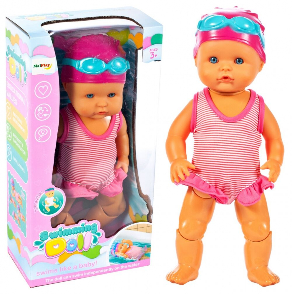 Papusa bebe Bobas Inotatoare, care inoata pe spate si pe burta, cu Casca, Ochelasi si Costum de baie incluse, 14 x 8.5 x 33 cm
