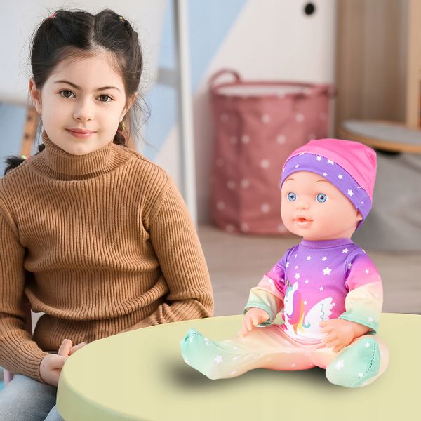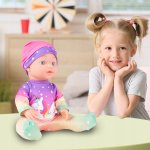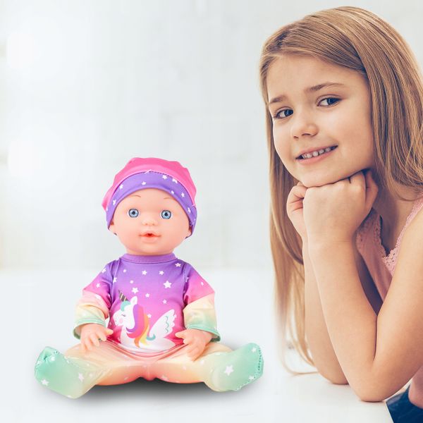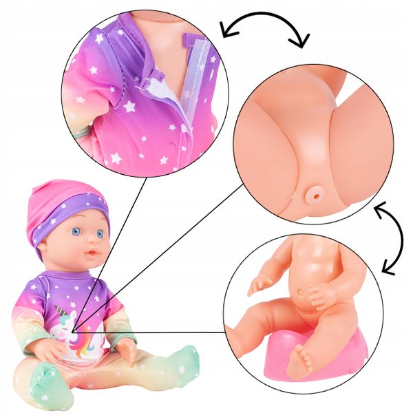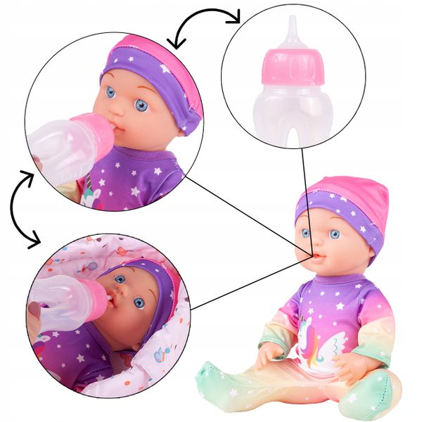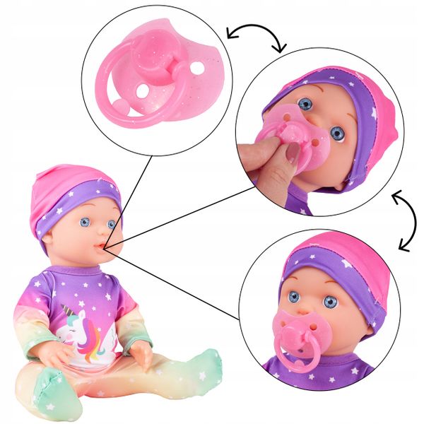 Papusa imbracata intr-o salopeta colorata, cu un unicorn si o caciulita pe cap, ea incurajeaza imbratisarea, sarutul si jocul.Poti schimba papusa, bea din biberon sau sa-i pui o suzeta in gura.
