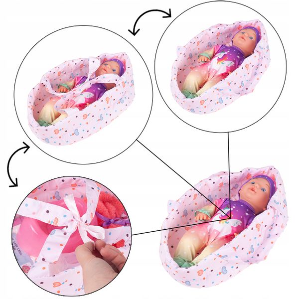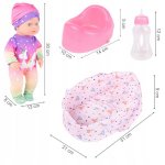 Papusa bebe care bea din biberon si face pipi la olita, cu suzeta si cosulet de transport incluse, 30 cm, Pink