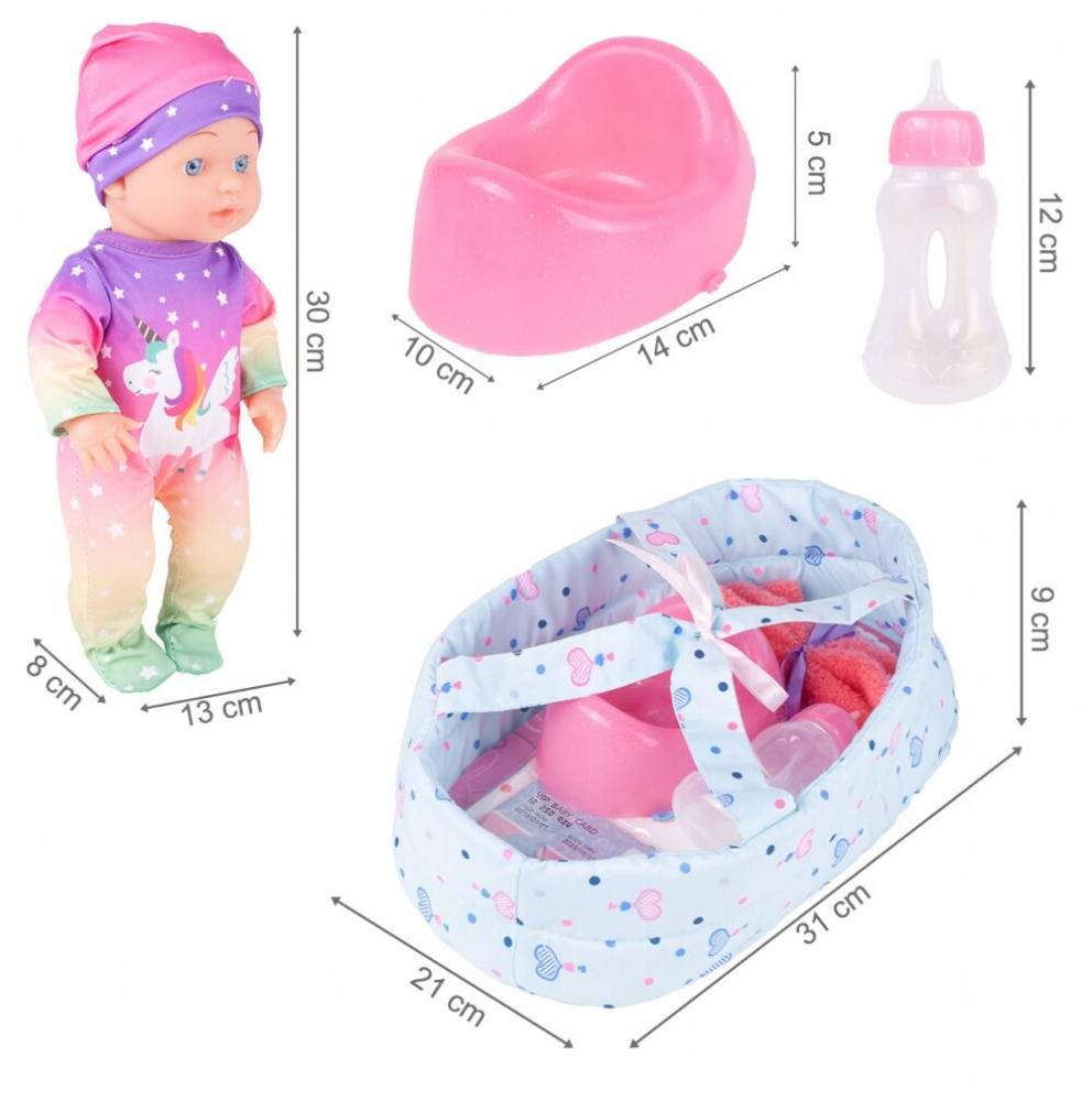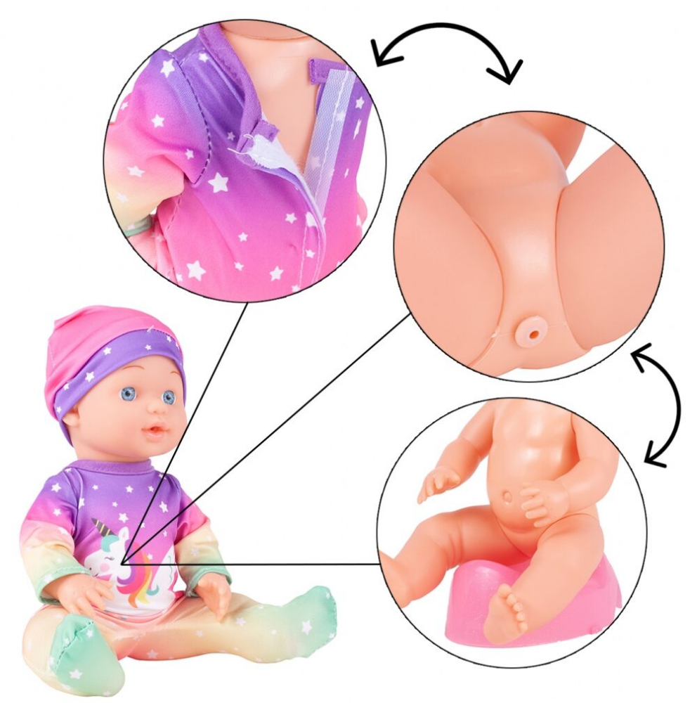 Papusa imbracata intr-o salopeta colorata, cu un unicorn si o caciulita pe cap, ea incurajeaza imbratisarea, sarutul si jocul.Poti schimba papusa, bea din biberon sau sa-i pui o suzeta in gura.