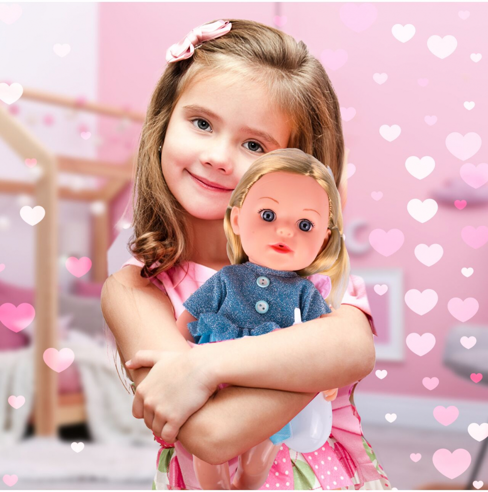 Micuta blonda poate bea dintr-o sticla si apoi face pipi in olita, ceea ce adauga autenticitate si ii invata pe copii responsabilitatea. In plus, papusa poate scoate sunete precum rasul sau plansul, ceea ce ii implica si mai mult pe micii gardieni.