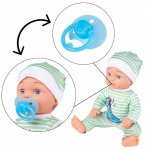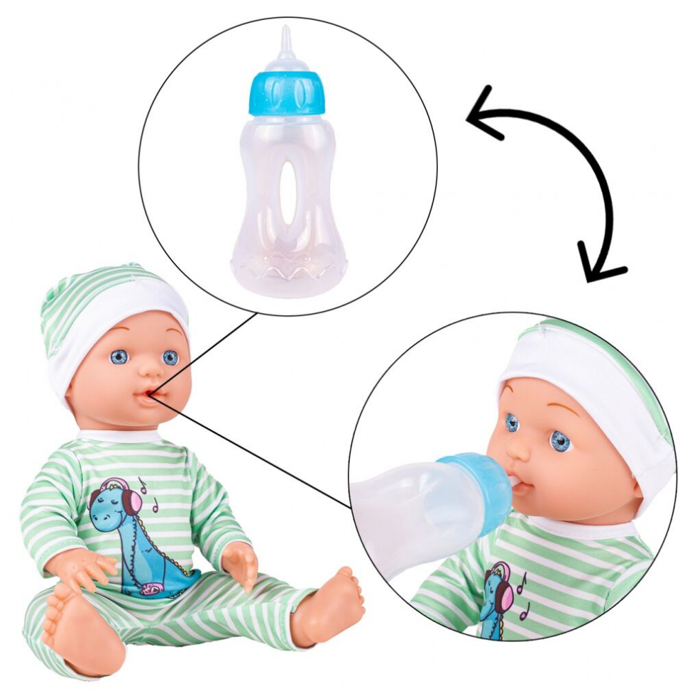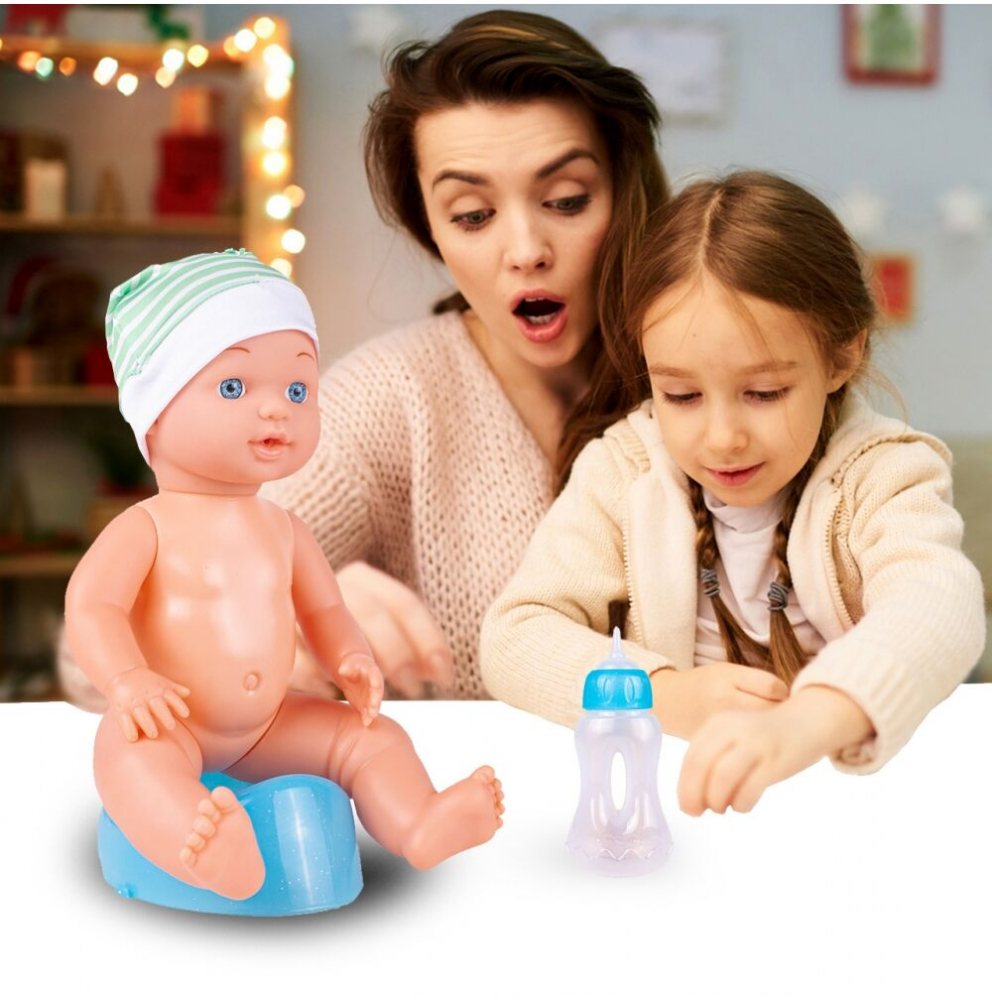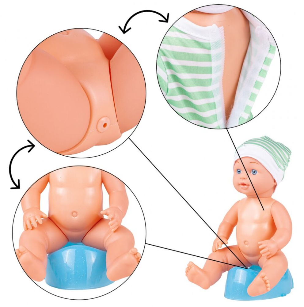Papusa poate fi schimbata, hranita, da apa dintr-o sticla sau pune o suzeta in gura. Bebelusul va face pipi chiar si in olita sau scutec.
