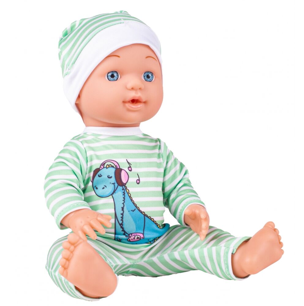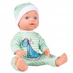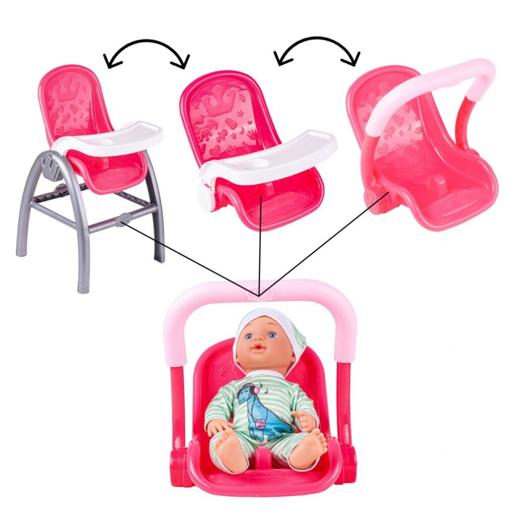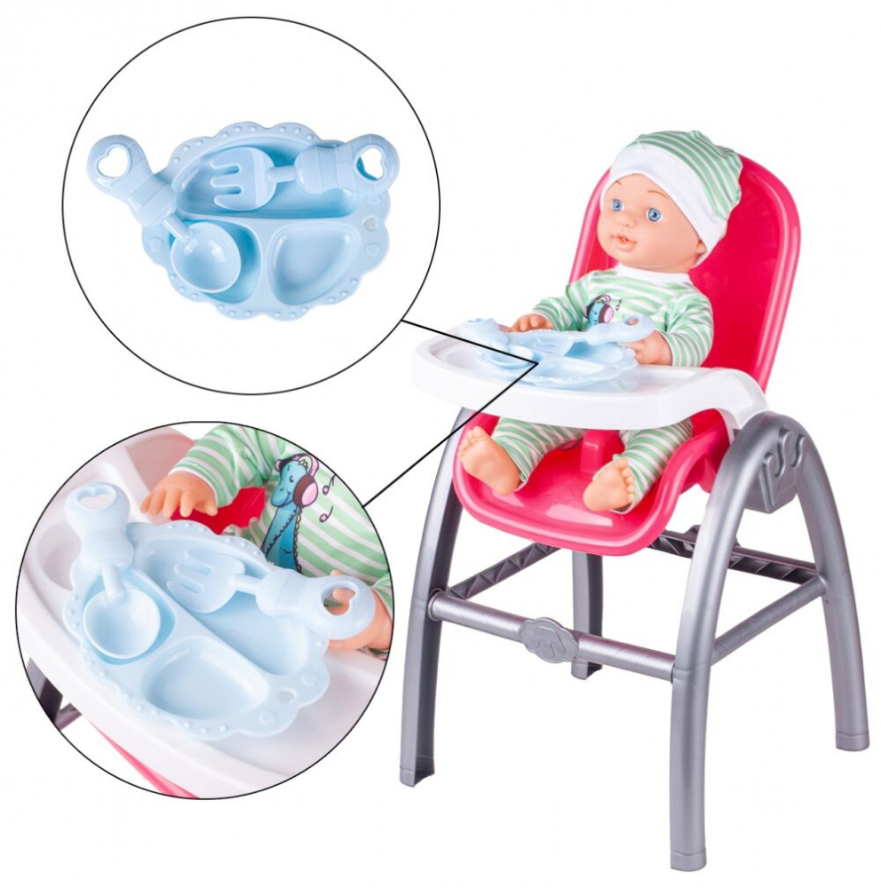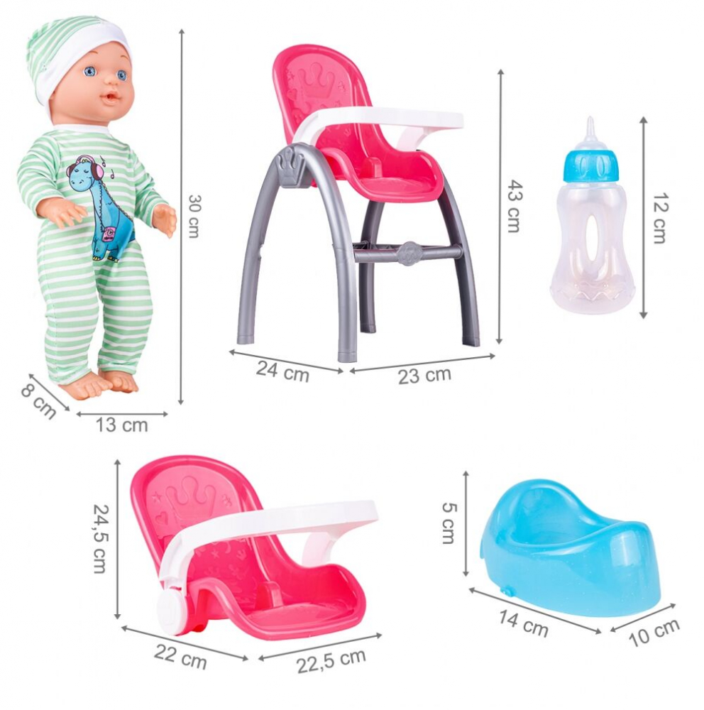 O papusica imbracata intr-o salopeta in dungi verzi cu dinozaur, avand drept accesoriu o olita si un scaun de hranire, este setul perfect pentru fiecare fetita.