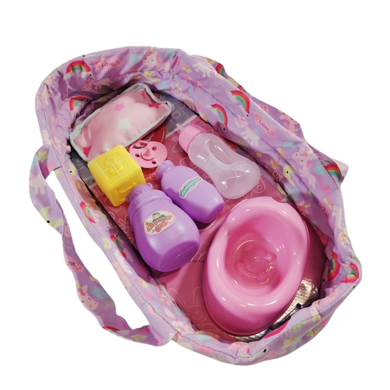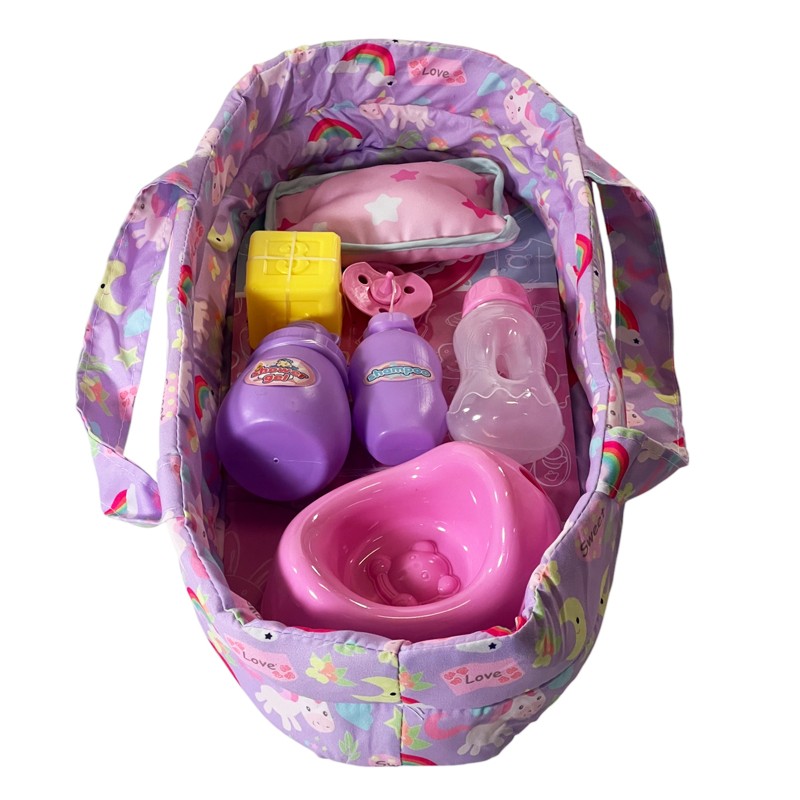 Setul include un landou pentru transportul papusii, care face jocul mai realist si mai distractiv, sticlute pentru hranirea papusii, care le permite celor mici sa simuleze momentul de hranire, invatand despre responsabilitatea de a avea grija de un bebelus sau o olita care le permite copiilor sa exerseze scenarii de invatare a curateniei, incurajand jocul educativ si interactiv.