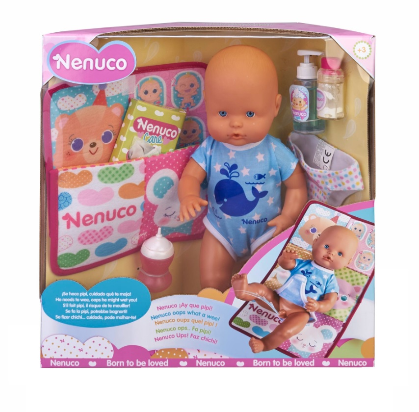 Nenuco este facuta dintr-un material de calitate buna si masoara 35 cm, poarta un body albastru care se inchide usor, poate fi imbracat si dezbracat.