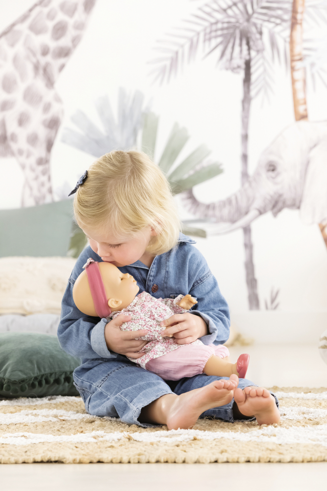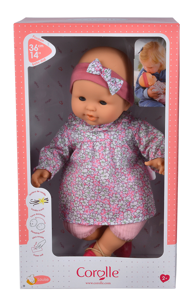 Louise este o papusa cu corp moale, de 36 cm, cu ochi albastri adormiti.