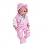 Papusa bebelus Doris Pola 40 cm cu hanorac cu gluga si urechiuse roz,salopeta si botosei,corp moale in cutie cadou