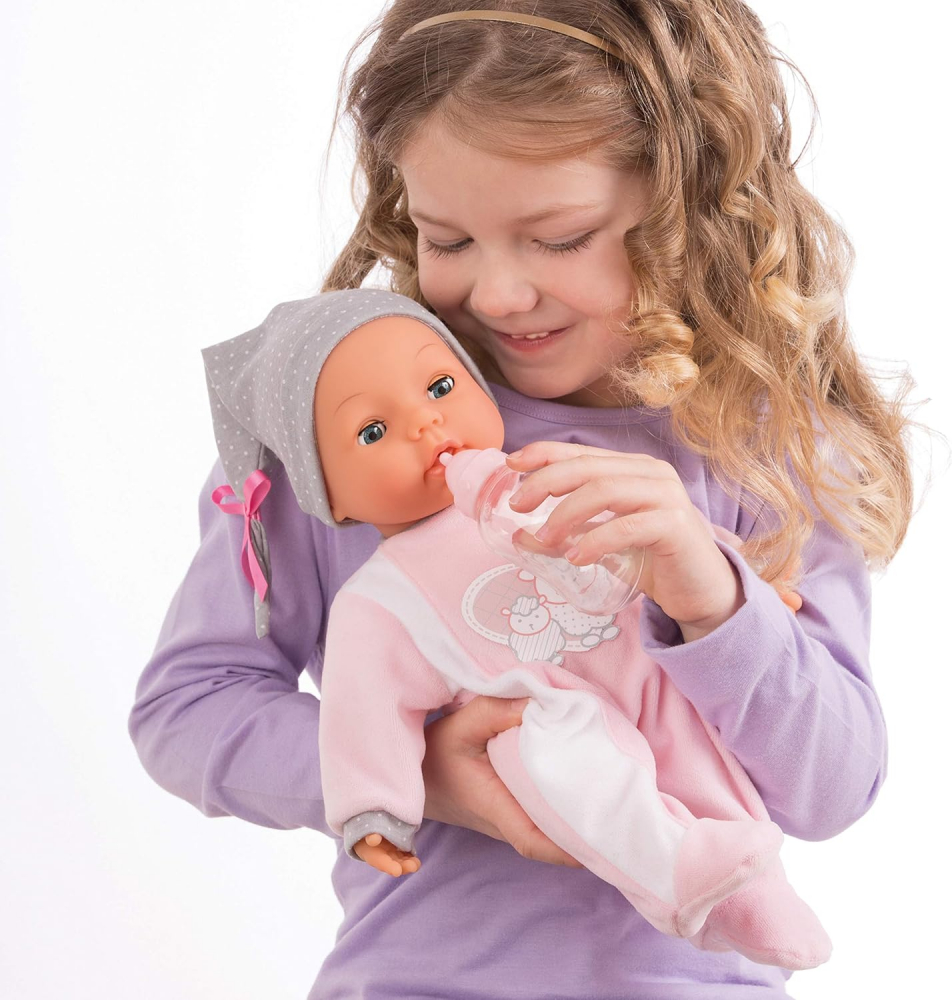 Papusa bebelus interactiv cu hainute din catifea si accesorii hranire incluse Piccolina 38 cm