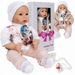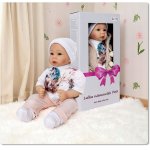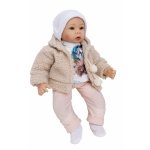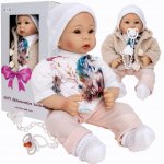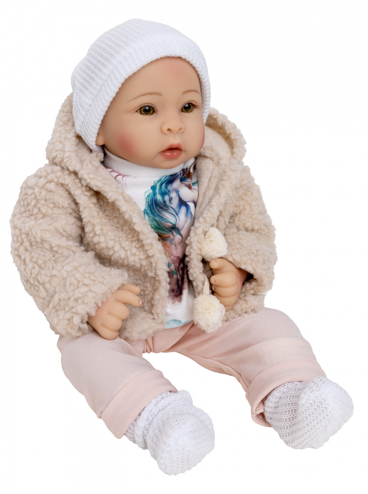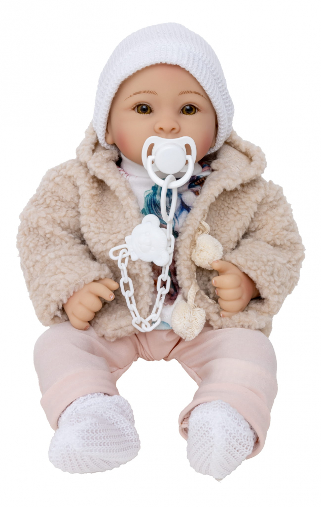 Papusa bebelus interactiv Doris Amelie 40 cm cu suzeta,corp moale si tinuta de iarna,hainuta groasa,caciulita,botosei,in cutie cadou