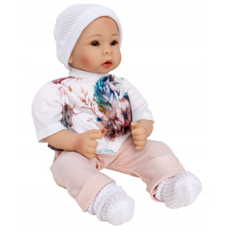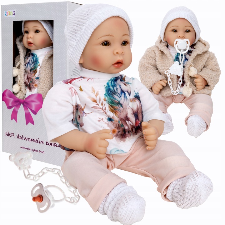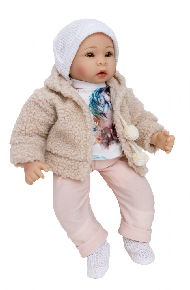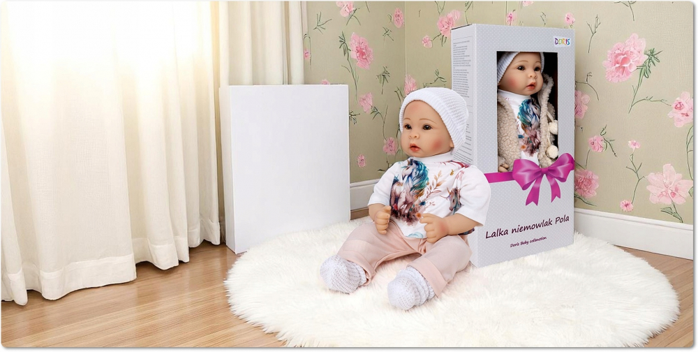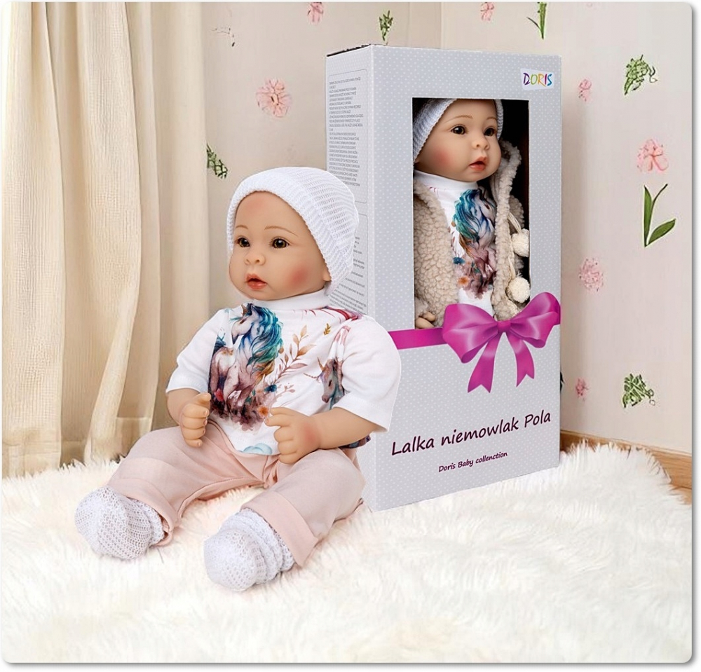 Frumoasa papusa Pola , cu fata ei vesela, arata exact ca un bebelus adevarat.Aceasta papusa realista, cu un aspect dulce si expresiv, este pregatita pentru joaca in orice anotimp.