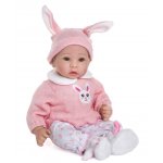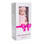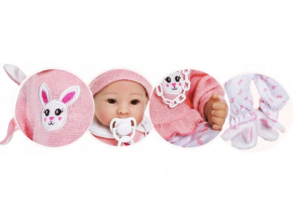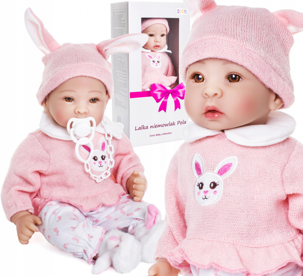 Papusa bebelus interactiv Doris Pola 40 cm cu corp moale,suzeta inclusa,hainute detasabile,caciulita cu urechiuse roz si botosei pufosi in cutie cadou