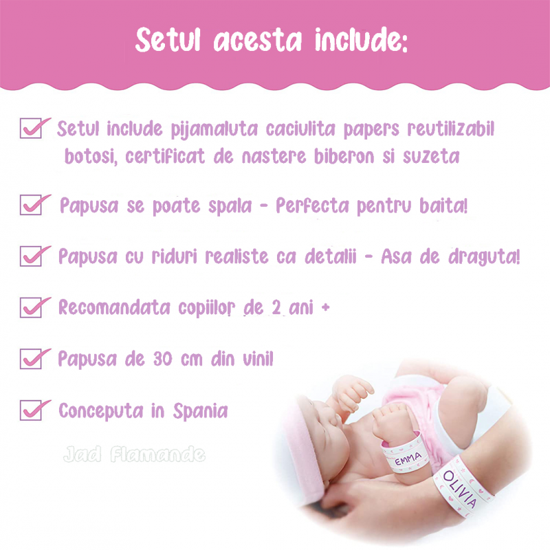 Papusa bebelus vine insotita de un biberon, o suzeta, o pereche de botosei, un scutec, bratara din maternitate atat pentru bebe cat si pentru mamica si certificat de nastere care poate fi personalizat cu numele si alte date de