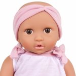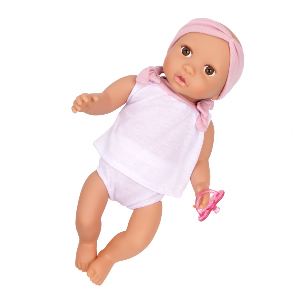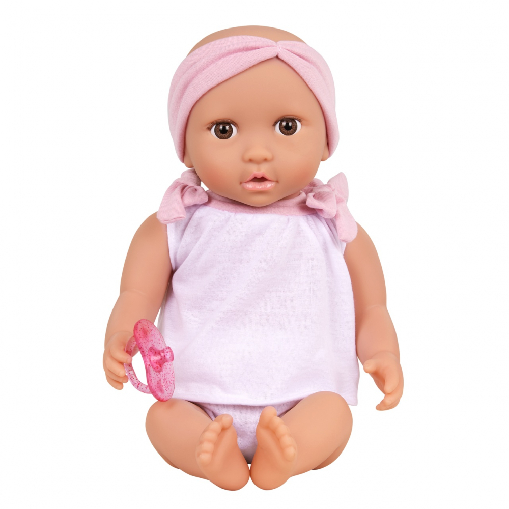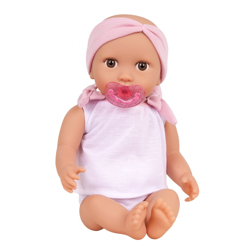 - papusa este imbracata intr-o tinuta draguta din 2 piese cu o bentita roz asortata si o suzeta detasabila,