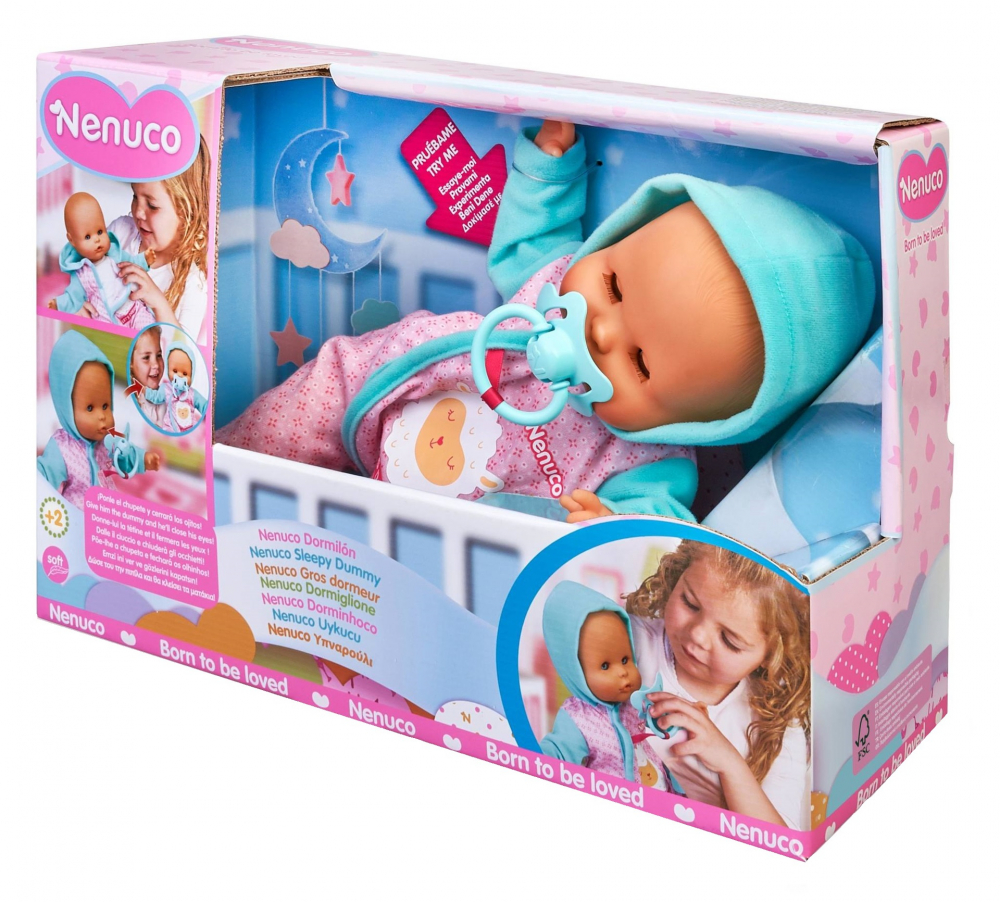 Nenuco are un corp moale, poarta un set dragut de pijamale roz cu albastru cu gluga, pe care il poti indeparta, pentru a-l spala.
