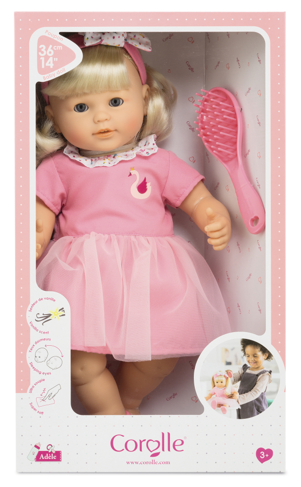 Adele este o papusa cu corp moale, inaltime de 36 cm, pentru cei mici care doresc sa-l iubeasca ca pe propriul copil.