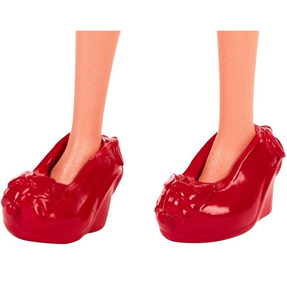 Papusa poarta o tinuta si pantofi in culori stralucitoare, cu printuri florale