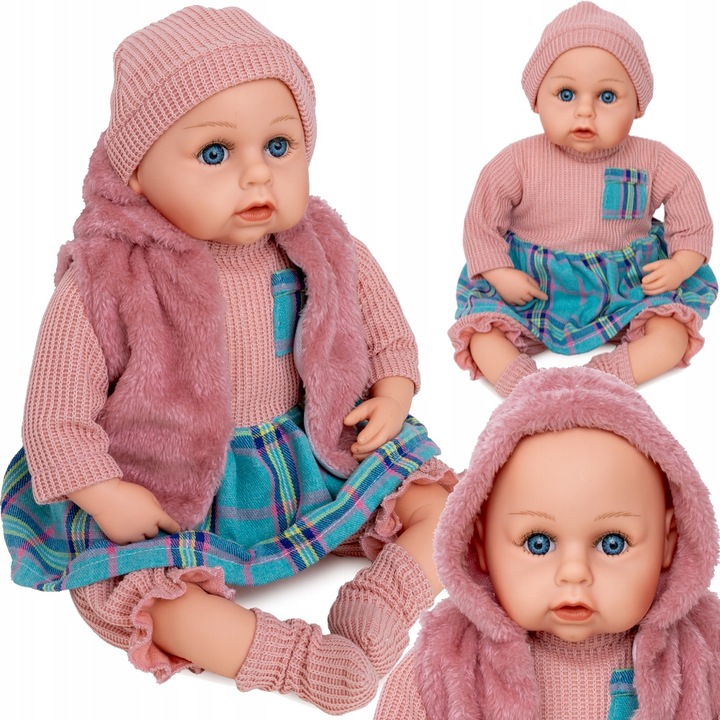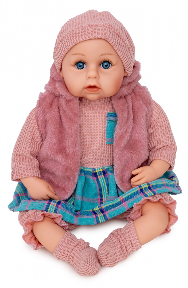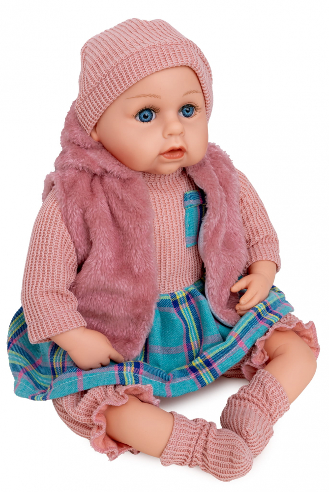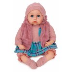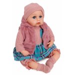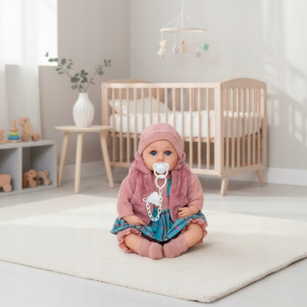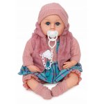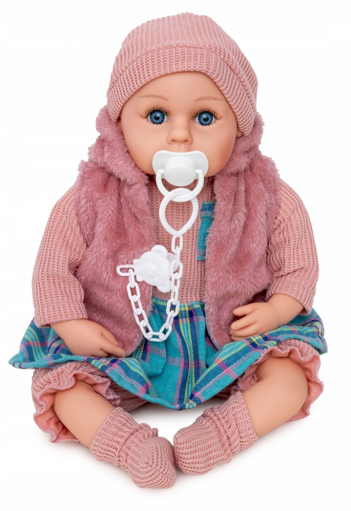 Papusa fetita bebelus Doris Rose 45 cm cu aspect realist si suzeta,corp moale,hainute detasabile, rochita, vesta,botosei si caciulita asortate