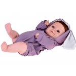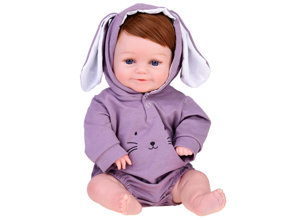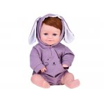 Papusa este imbracata intr-un body iepuras cu gluga, intr-o culoare discreta.