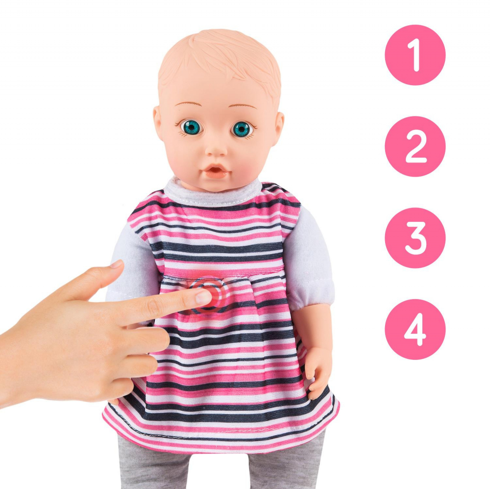 Dupa ce este apasata pe burtica,papusa rade, plange, spune: Mama, spune: Tata.