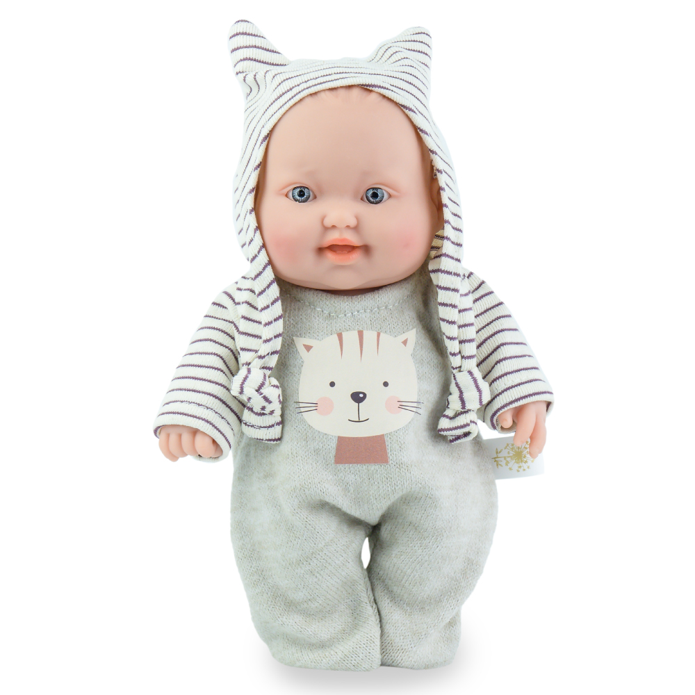 Simpatica papusa este realizata manual, cu detalii realiste fine si ochi atractivi. Designul hainutelor si imprimeul pisica transforma micuta papusa intr-un personaj simpatic.
