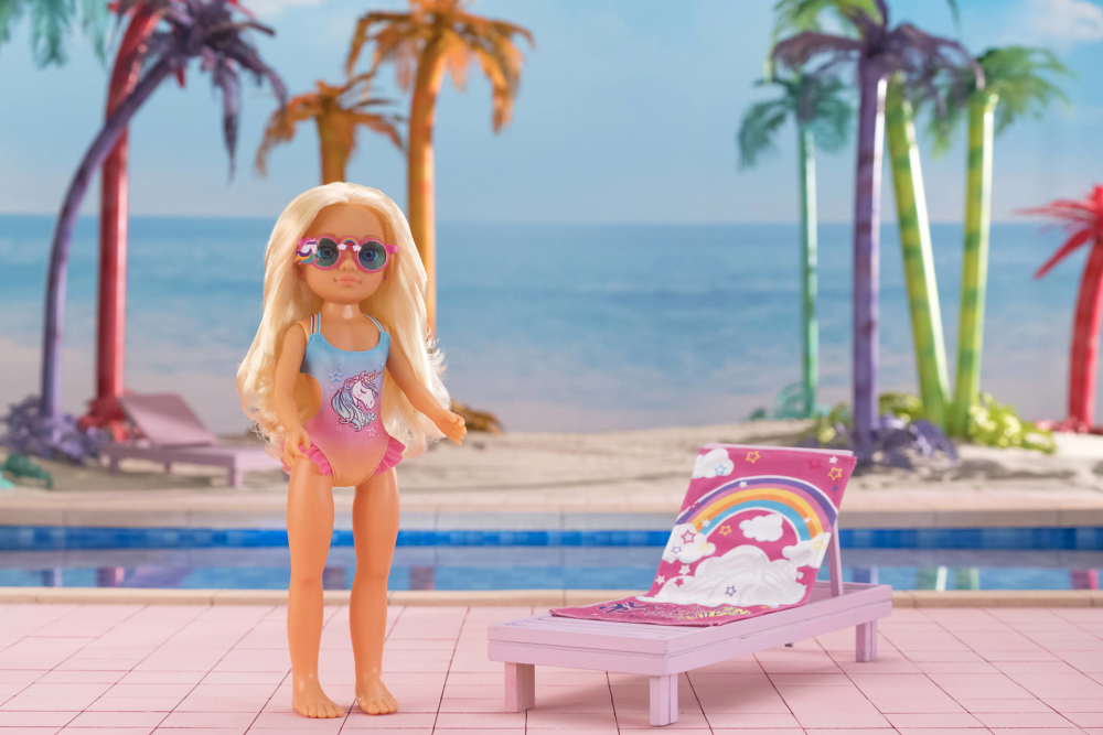 In plus fata de acest accesoriu, Nancy poarta un costum de baie cu un alt unicorn asortat si volanase in culori fanteziste.