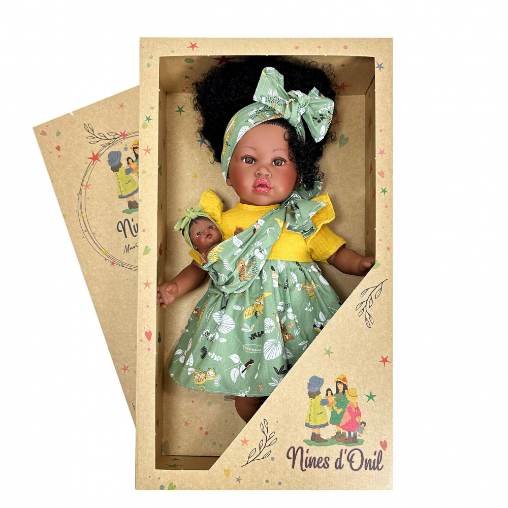 Papusa Nines D’Onil, Maria Afro, cu sunete, cu bebelus, cu rochie verde, cu miros de vanilie, 45 cm