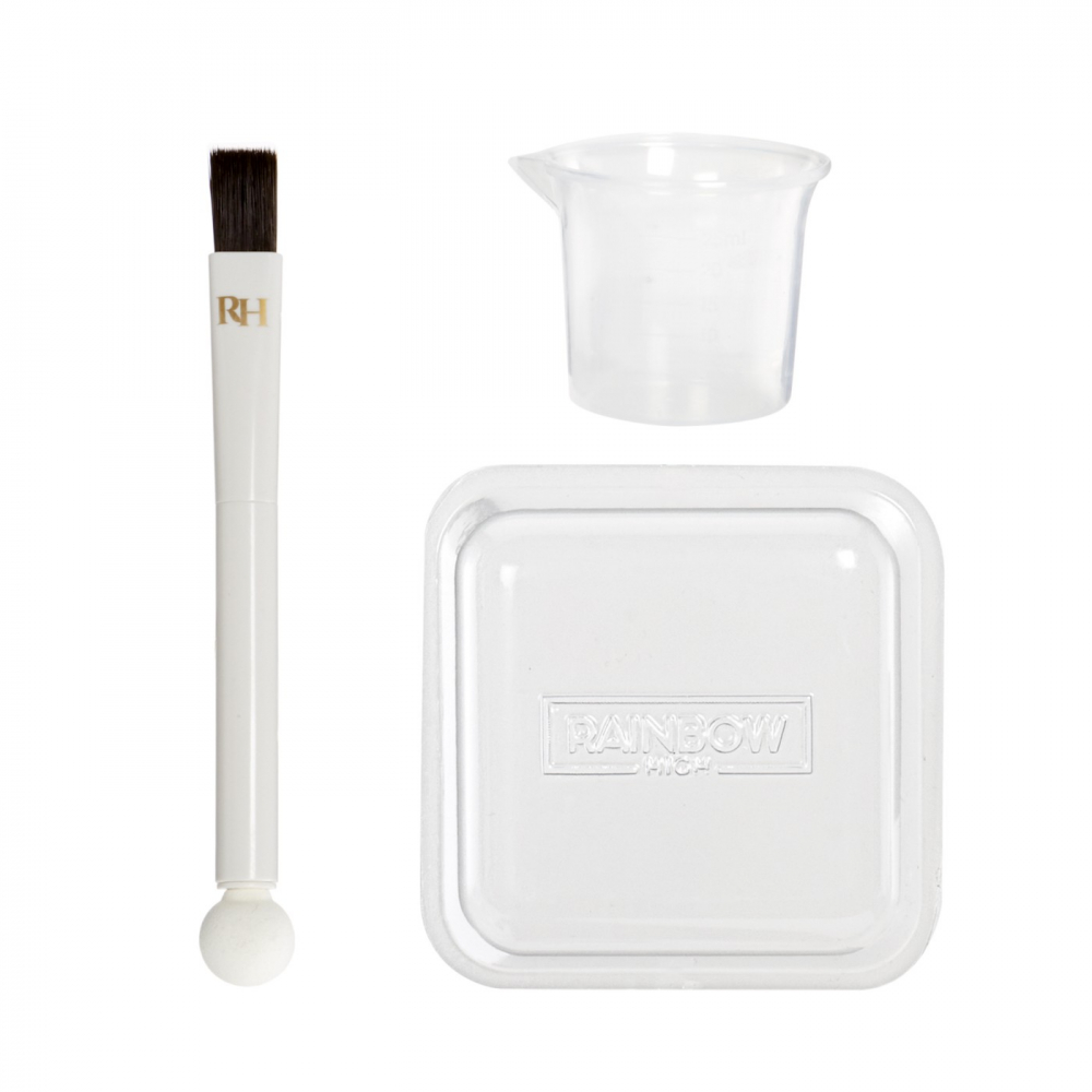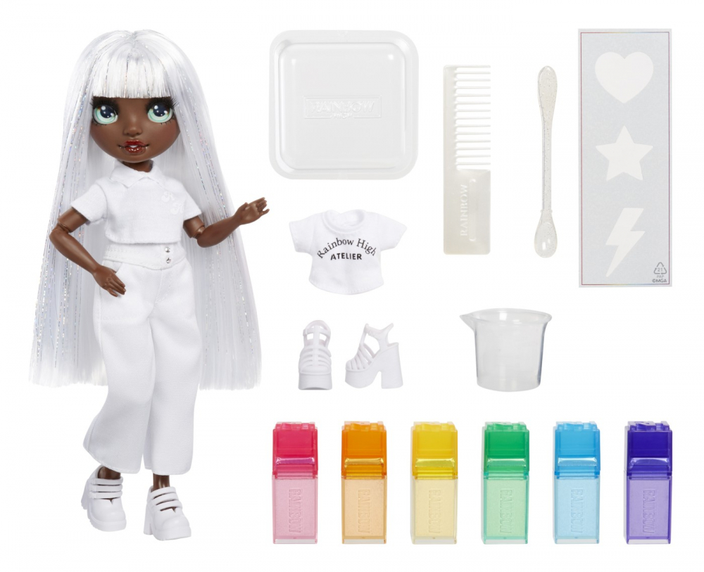 Este inclusa 1 papusa exclusiva cu o tinuta complet alba si incaltaminte pentru papusa plus tricou si pantofi bonus, 6 acuarele lavabile colorate, burete cu doua capete, elastice, sablon, pahar de masurare, bol de unica folosinta, lingura si pieptene.