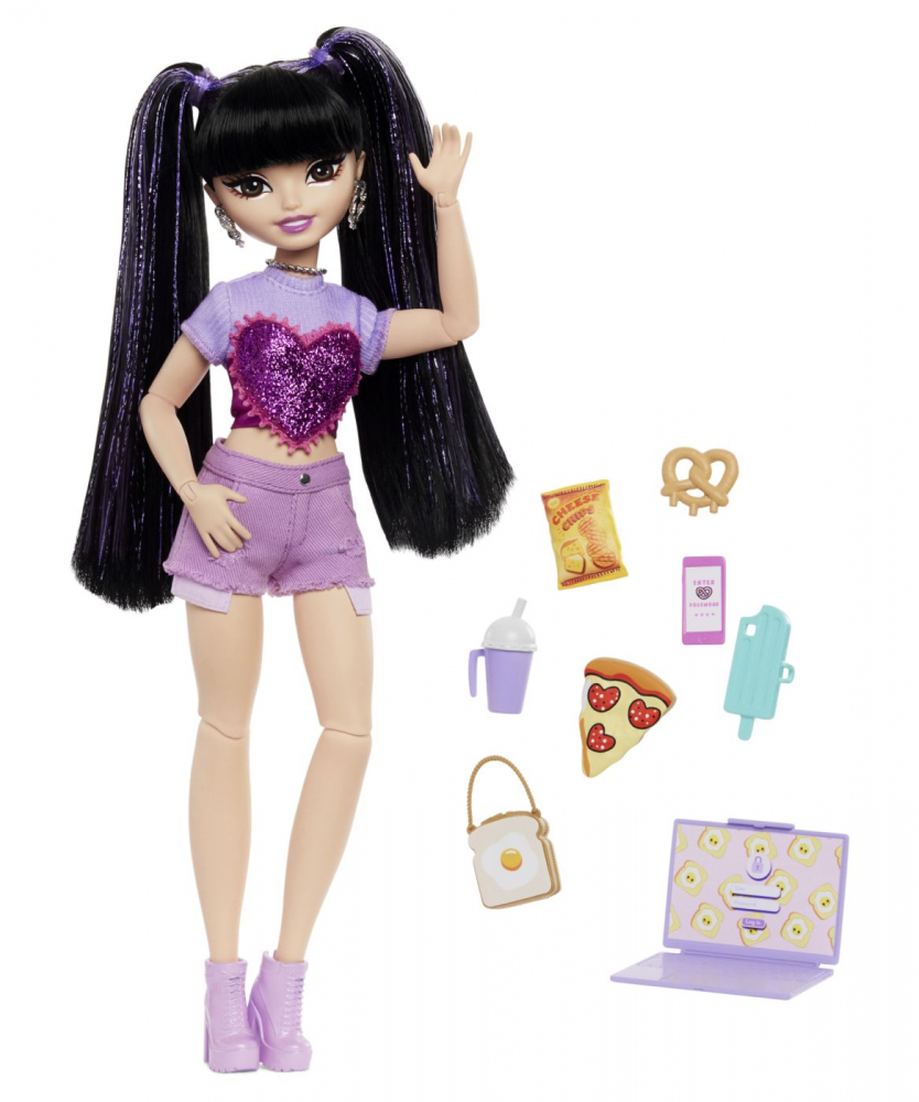 Papusa este articulabila si poarta haine detasabile, cum ar fi crop-ul ei stralucitor cu inima violet, pantaloni scurti si cizme din denim mov!