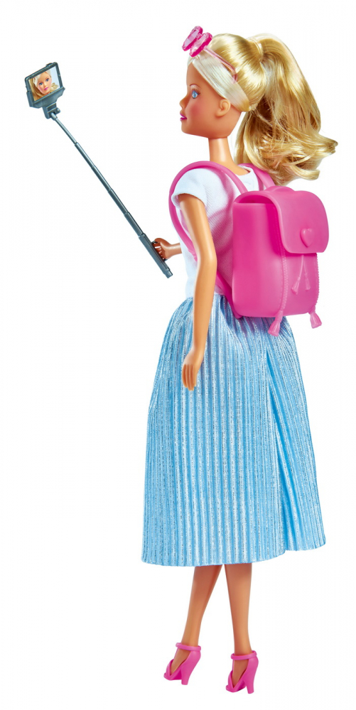 Echipata cu un rucsac, ochelari de soare si stick pentru selfie, Steffi se plimba prin oras si isi ia cele mai bune selfie-uri ca suvenir.