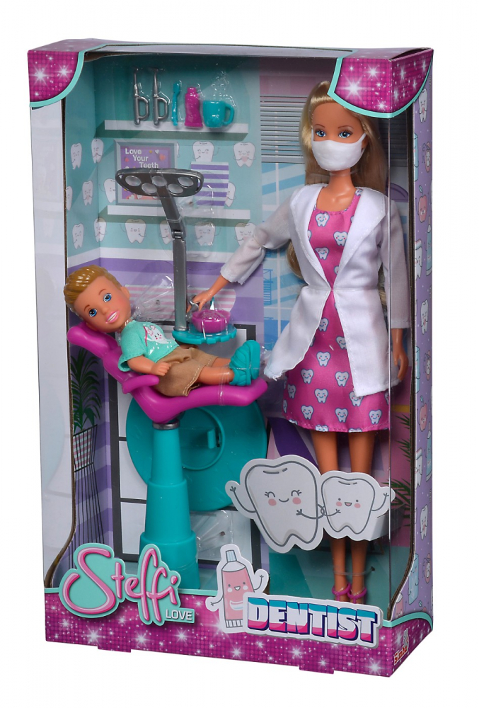 Papusa Steffi este de data aceasta dentist, iar Timmy este pacientul ei curajos.