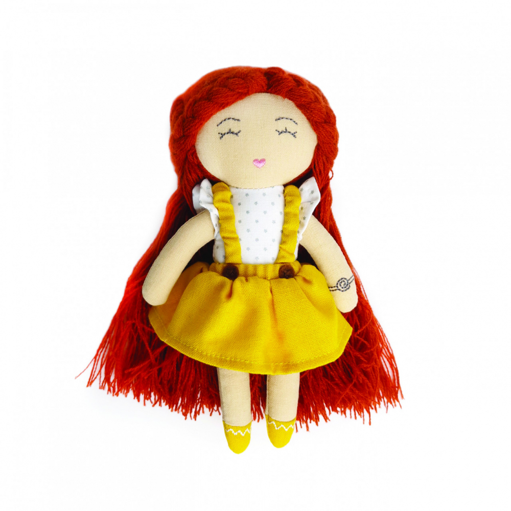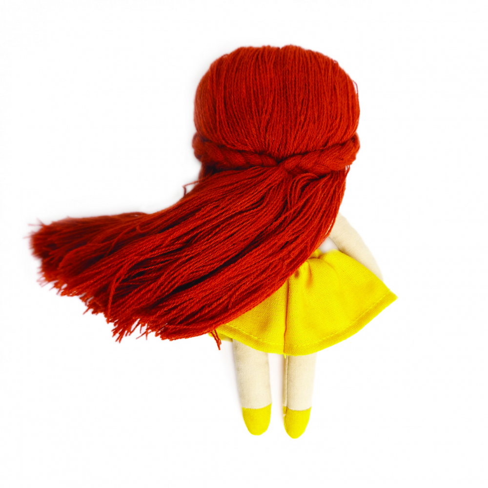 Păpușa "Lora" are 20 cm lungime, trăsături faciale brodate, păr lung roscat, body din bumbac alb și rochie galbena, care poate fi scoasă și înlocuită.