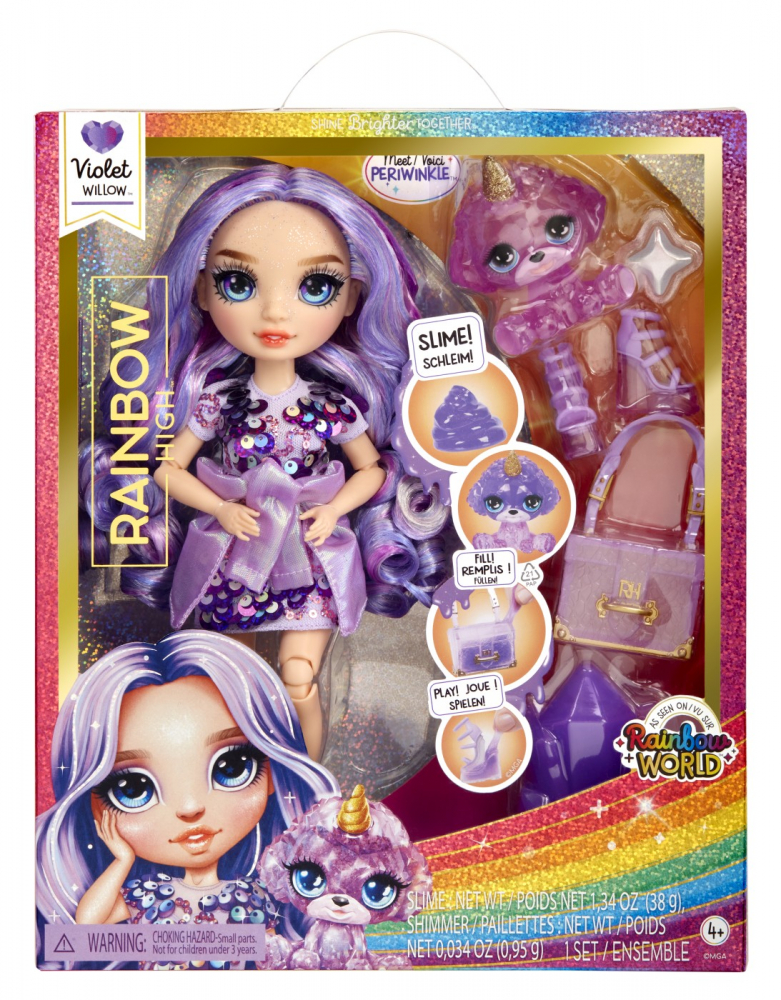 Include o papusa cu tinuta completa, pantofi, geanta, animal de companie, slime si sclipici.