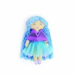 Papusa zână are o lungime de 20 cm, trăsături faciale brodate, păr lung albastru, un body mov din satin și o rochie din tul albastru care poate fi.îndepărtată și înlocuită.
