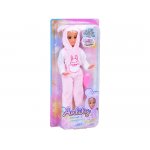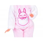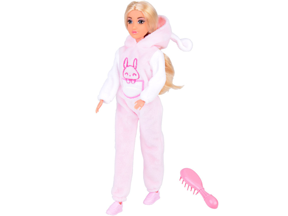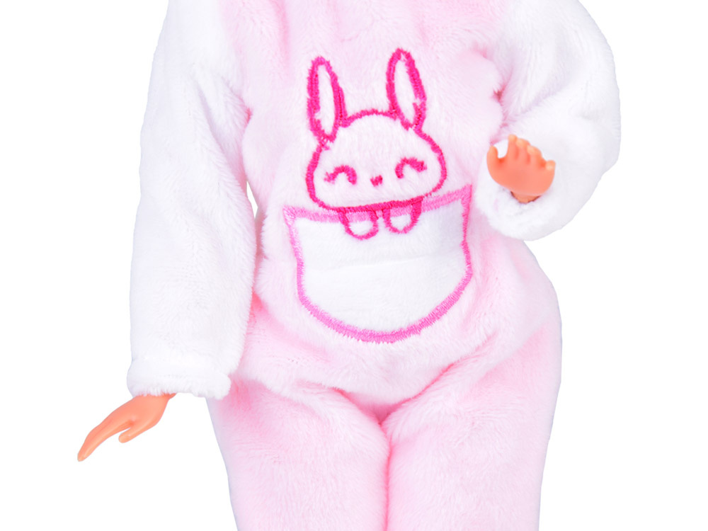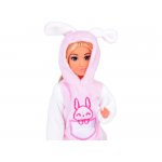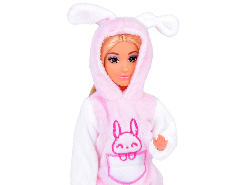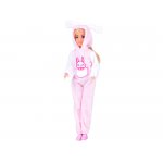 Papusica Anlily cu membrele mobile, parul lung si blond, in costumatie de iepuras roz, inaltime 30 cm