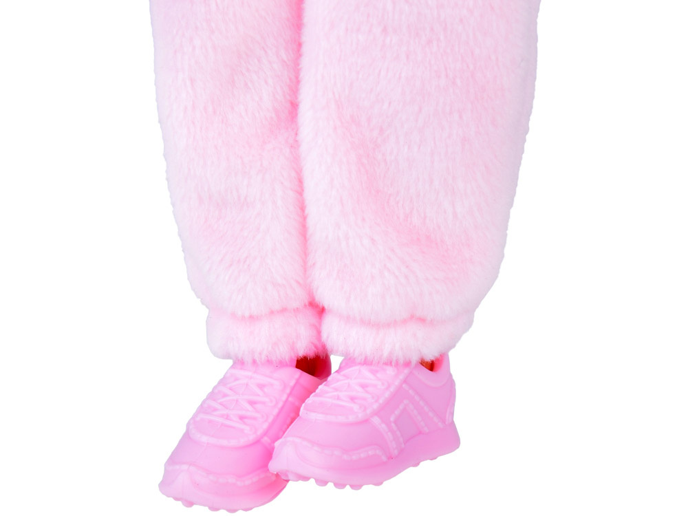 Tinuta Trendy: Poarta o costumatie adorabila de iepuras roz care starneste imaginatia, completata de o pereche de adidasi roz super la moda. Gluga tinutei are un decupaj special pentru par.