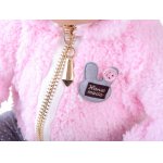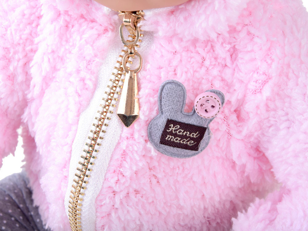 Imbracaminte: Nu are par, dar este protejata de frig de un hanorac roz, cald si placut la atingere, completat de colanti stilati cu buline gri.