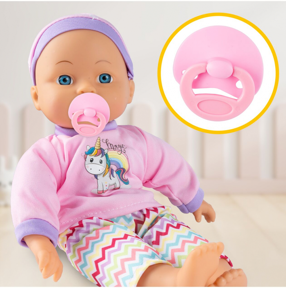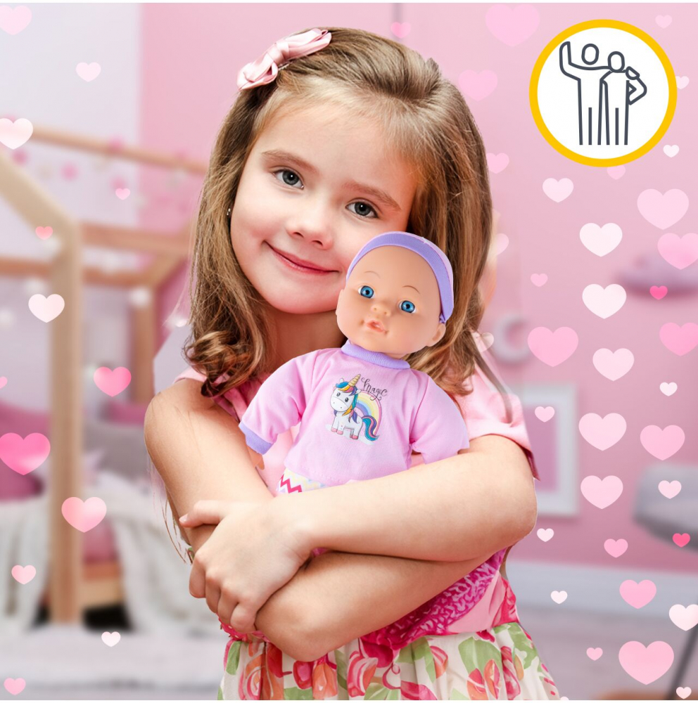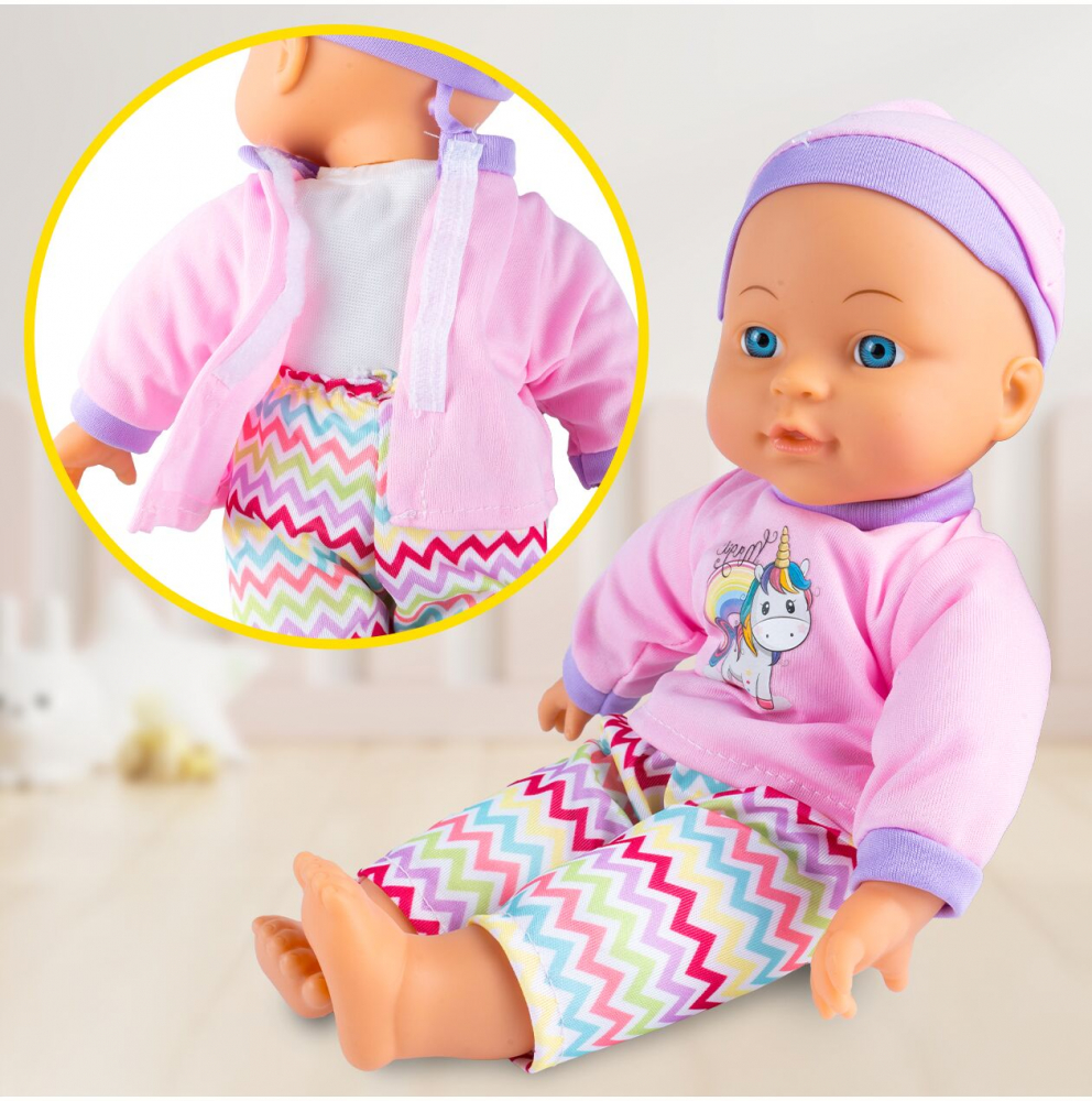 Papusica bebe pentru copii Malplay Pink Unicorn, cu hainute, biberon si suzeta inclusa, inaltime 30 cm