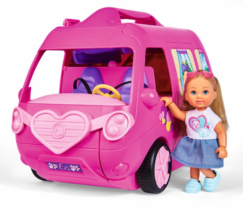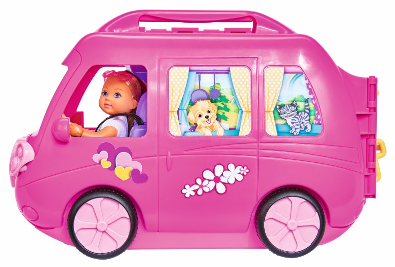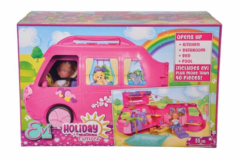 Papusa Evi cu articulatii mobile + rulota pentru camping, ce include bucataria, baia, piscina si multe accesorii, 25 cm