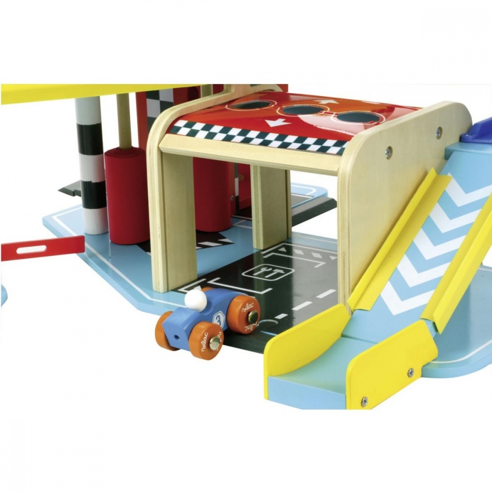 O minunata parcare supraetajata, din lemn, de mari dimensiuni, cu accesoriile din imagine incluse: 2 masinute si 1 elicopter.
