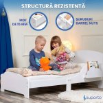 Cu un design ergonomic și elegant, de culoare albă, acest pat copii de la Suporto se integrează perfect în orice decor de cameră. Indiferent de stilul ales, această piesă de mobilier va adăuga o notă de rafinament și va completa armonios încăperea. Designul versatil este ideal atât pentru fete, cât și pentru baieti, făcându-l o alegere universală și practică pentru părinți.